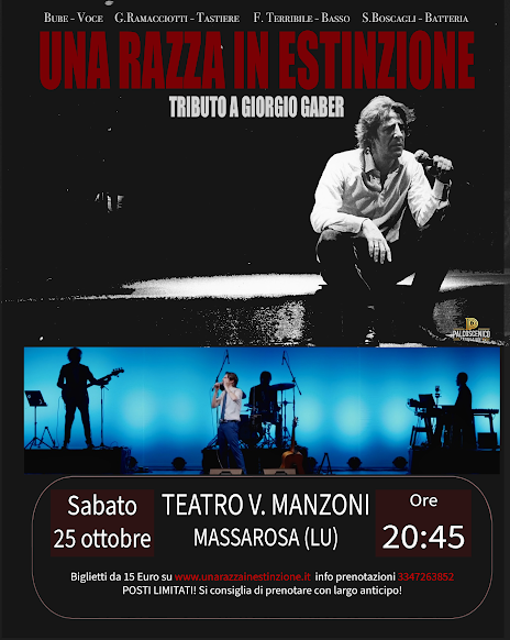 "Una Razza in Estinzione - Tributo a Giorgio Gaber" è un viaggio emozionante nell’universo artistico di uno dei più grandi cantautori e teatranti italiani. Lo spettacolo, che mescola il teatro canzone con la riflessione sociale e politica, offre un’esperienza unica, capace di far rivivere le parole e le canzoni di Gaber in modo inedito e coinvolgente. Attraverso le sue opere, Gaber ha sempre raccontato la realtà in modo diretto, senza filtri, cercando di interrogare la coscienza collettiva e individuale. Questo tributo vuole rendere omaggio alla sua figura, portando sul palco le sue riflessioni più intime e le sue canzoni più iconiche. Un’opera che non solo celebra l’eredità di Gaber, ma invita il pubblico a fermarsi, pensare e mettersi in discussione. L’obiettivo non è solo quello di ricordare, ma di riportare alla luce le emozioni e i temi universali che ancora oggi risuonano con forza. Ogni spettacolo è un momento di incontro, un’opportunità per riscoprire un'artista che ha fatto la storia della musica e del teatro in Italia. Sul palco i protagonisti sono la BUBE'S Band : Claudio BUBE Iannuzzi attore, voce e chitarra, Giulio Ramacciotti pianoforte, tastiere e programmazioni, Francesco Terribile basso, Samuele Boscagli batteria.