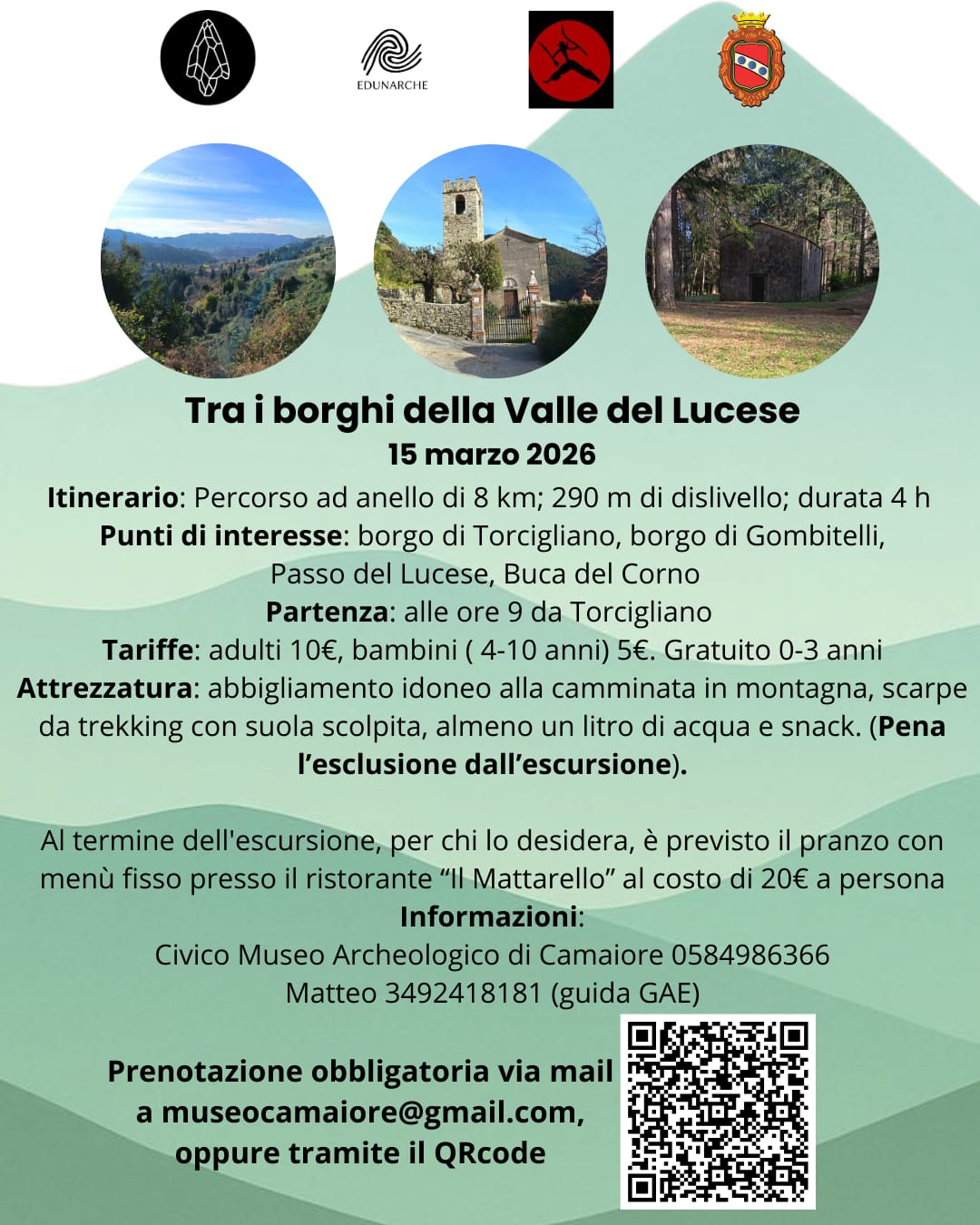 Escursione a piedi da Torcigliano al Passo del Lucese e ritorno, lungo un percorso ad anello di 8 km; 290 m di dislivello; durata 4 h Punti di interesse: borgo di Torcigliano, borgo di Gombitelli, Passo del Lucese, Buca del Corno Partenza: alle ore 9 da Torcigliano Tariffe: adulti 10€, bambini ( 4-10 anni) 5€. Gratuito 0-3 anni Attrezzatura: abbigliamento idoneo alla camminata in montagna, scarpe da trekking con suola scolpita, almeno un litro di acqua e snack. (Pena l’esclusione dall’escursione). Al termine dell'escursione, per chi lo desidera, è previsto il pranzo con menù fisso presso il ristorante “Il Mattarello” al costo di 20€ a persona.Prenotazione obbligatoria via mail a , oppure tramite il QRcode presente sulla locandina