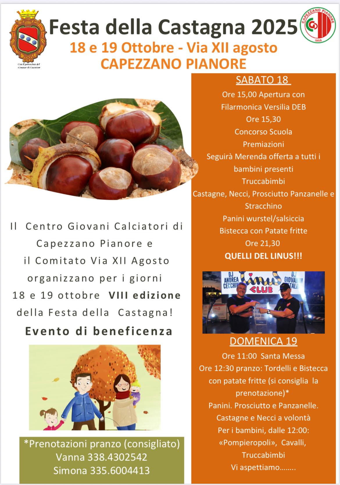 Torna la VIII edizione della FESTA DELLA CASTAGNA in Via XII agosto a Capezzano Pianore. SABATO 18:- Ore 15 apertura con Filarmonica Versilia DEB- Dalle ore 15.30 Concorso scuola, premiazioni, merenda per tutti i bambini, truccabimbi, castagne, necci, prosciutto, panzanelle e stracchino, panini wurstel/salsiccia e bistecca con patate fritte- Dalle ore 21.30 "Quelli del Linus!!!"DOMENICA 19:- Ore 11 S. Messa- Dalle ore 12, per i più piccoli: pompieropoli, cavalli e truccabimbi- Ore 12.30 pranzo: tordelli e bistecca con patate fritte (si consiglia la prenotazioneal 338 4302542/335 6004413)- Panini, prosciutto e panzanelle, castagne e necci a volontà