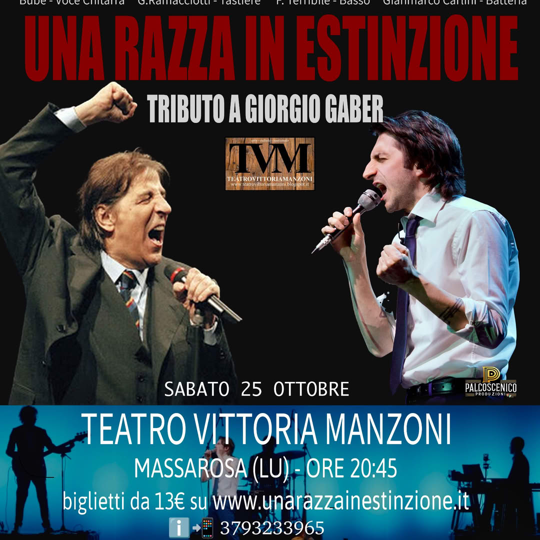 MASSAROSA (LU), il nostro Tributo a Giorgio Gaber è pronto per tornare al TEATRO VITTORIA MANZONI!Sabato 25 ottobre, ore 20:45!• Qualcuno era comunista• Io non mi sento italiano• La libertàUn viaggio emozionante tra i grandi classici di Gaber e Luporini. Emozione, riflessione e ironia in scena!Biglietti da 13 euro.